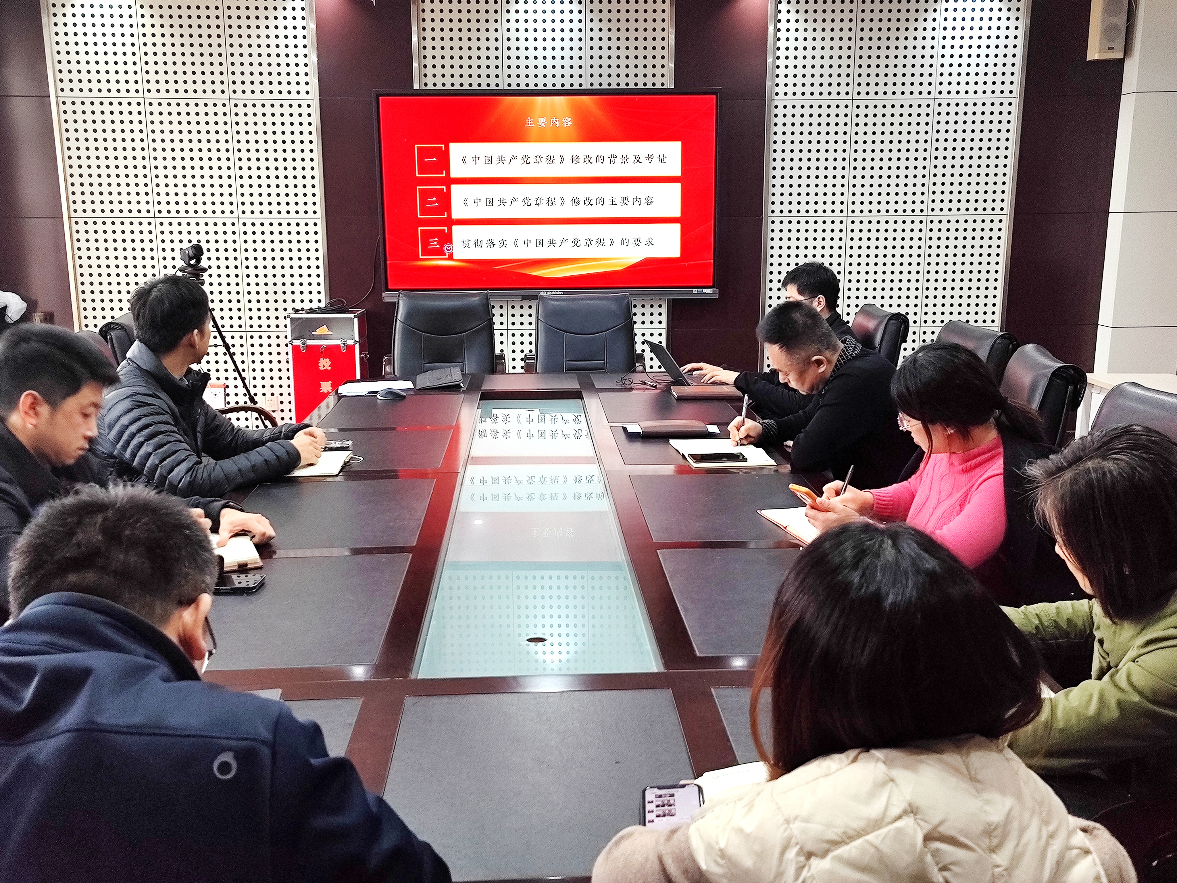 会上,全体成员共同观看中共中央党校(国家行政学院)党的建设教研部曹鹏飞教授讲授的学习贯彻《中国共产党章程》专题视频讲座。曹鹏飞从党章修改背景、修改内容和修改要求三个方面,对党的二十大审议的《中国共产党章程(修正案)》展开深入讲解,从党章修订的角度阐明了贯彻落实党的二十大精神具体要求。