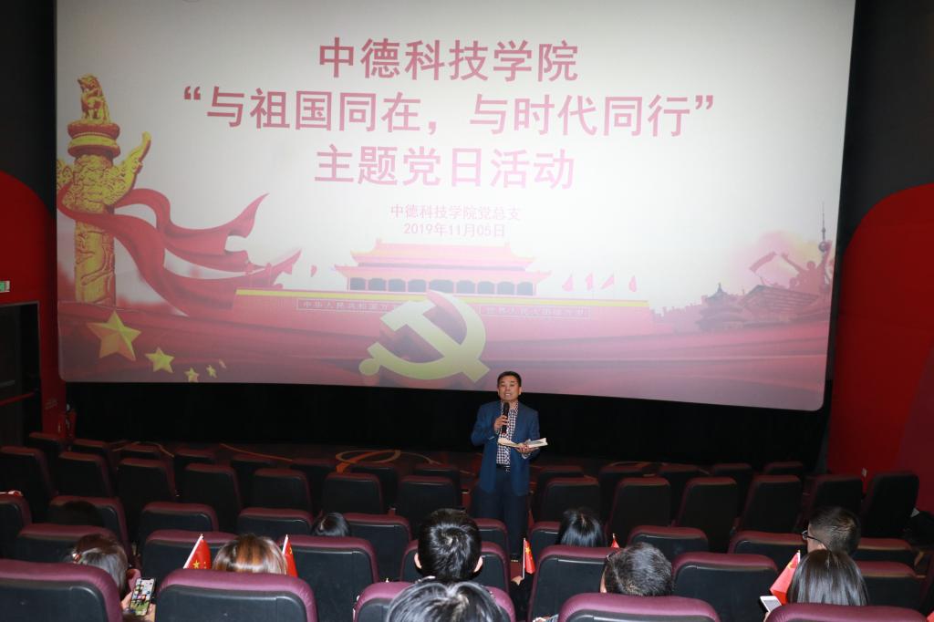为贯彻落实“不忘初心、牢记使命”主题教育精神,加强爱国主义教育。11月5日下午,威尼斯5994党总支创新主题教育学习模式,组织学院全体教师和学生党员走进电影院,开展了“与祖国同在,与时代同行”主题党日活动,活动共分为微党课、会前一首歌、观看爱国主义影片、学生形势政策教育、“五个一”志愿服务等环节。活动由院长李镇江主持。