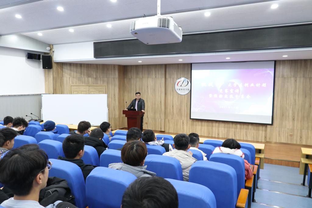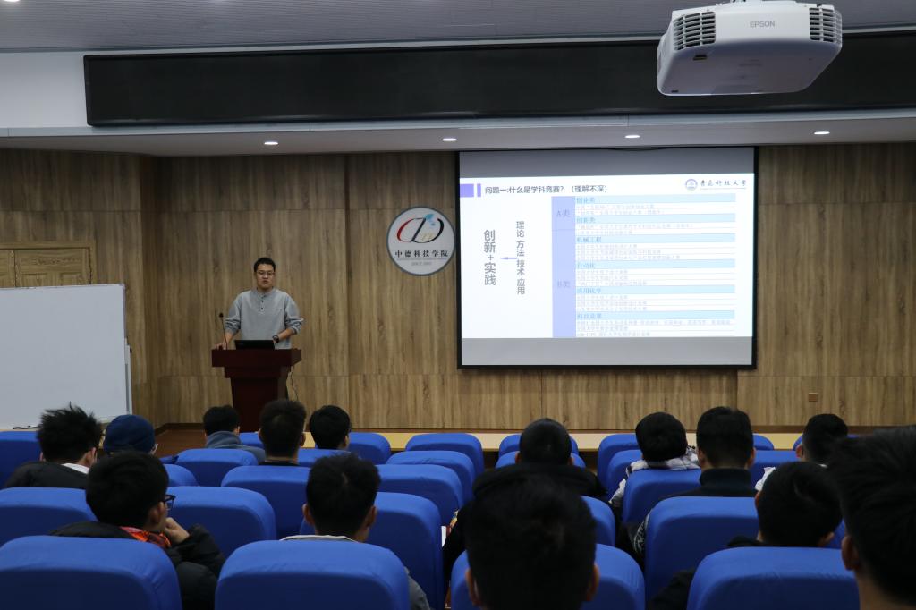 牛志宇从通过“什么是学科竞赛”、“为什么参加学科竞赛”、“如何寻找创意创新点”、“怎样准备比赛”四个问题展开,为同学们详细介绍了“挑战杯”中国大学生创业计划竞赛的评审细则、参赛组别、所需材料等问题,并结合自己的参赛经历与同学们进行经验交流分享。