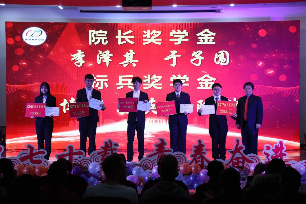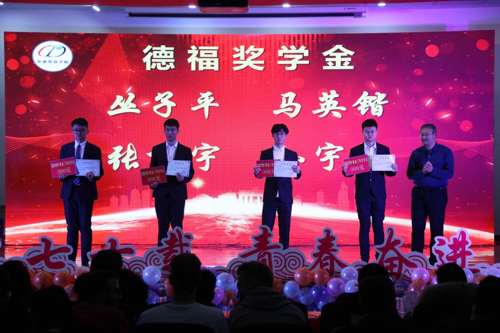 李镇江、任允晓、郭永、魏琳、王泽鹏分别为获院长奖学金、标兵奖学金、年度奖学金、德福奖学金、科技创新奖学金的优秀学生颁奖。