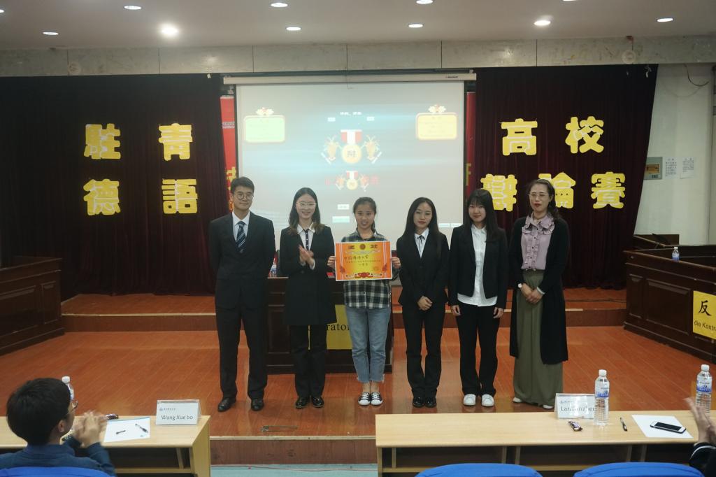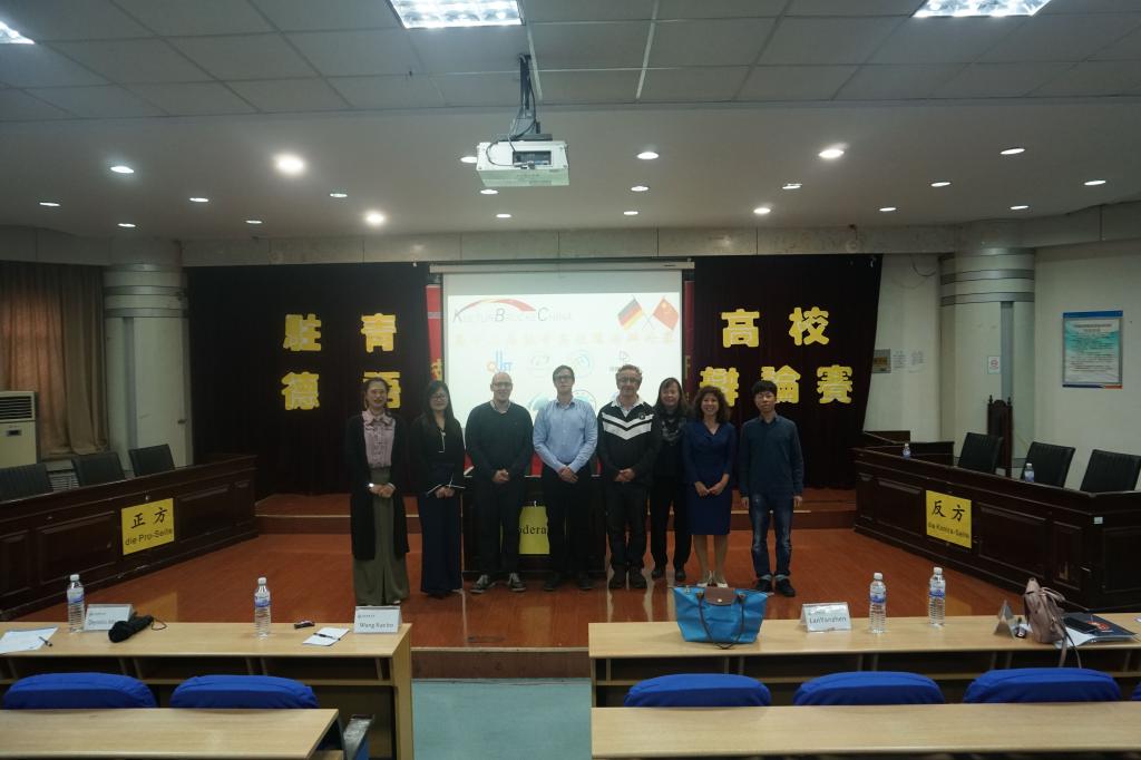 中国海洋大学外国语学院和青岛大学外国语学院代表队围绕Bedingungsloses Grundeinkommen - Utopie oder Alptraum?进行了精彩辩论。中国海洋大学外国语学院获第十二届驻青高校德语辩论赛的冠军,青岛大学外语学院获亚军,青岛科技大学外国语学院、威尼斯5994、中德工程学院获季军。