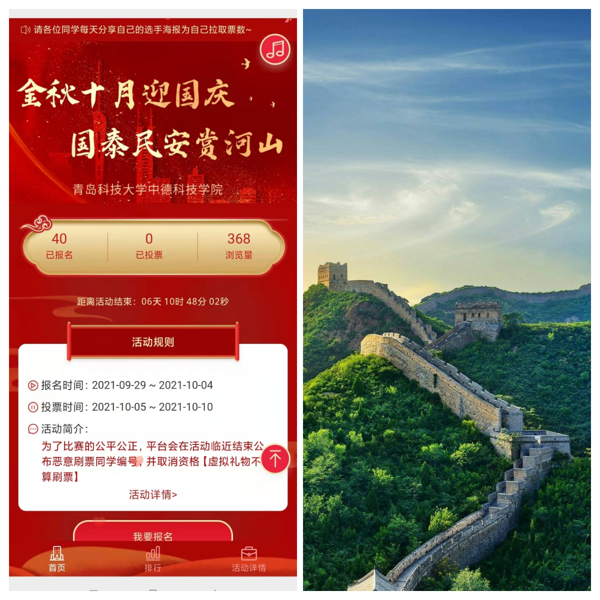 赏大好河山,赞祖国发展。通过线上线下举办“金秋十月迎国庆,国泰民安赏河山”照片展示分享活动,同学们积极报名参加,并分享祖国大好河山图景,诉说祖国每一处山脉、每一条溪流的传奇故事,感受祖国的发展变化,为祖国送上最诚挚的祝福。