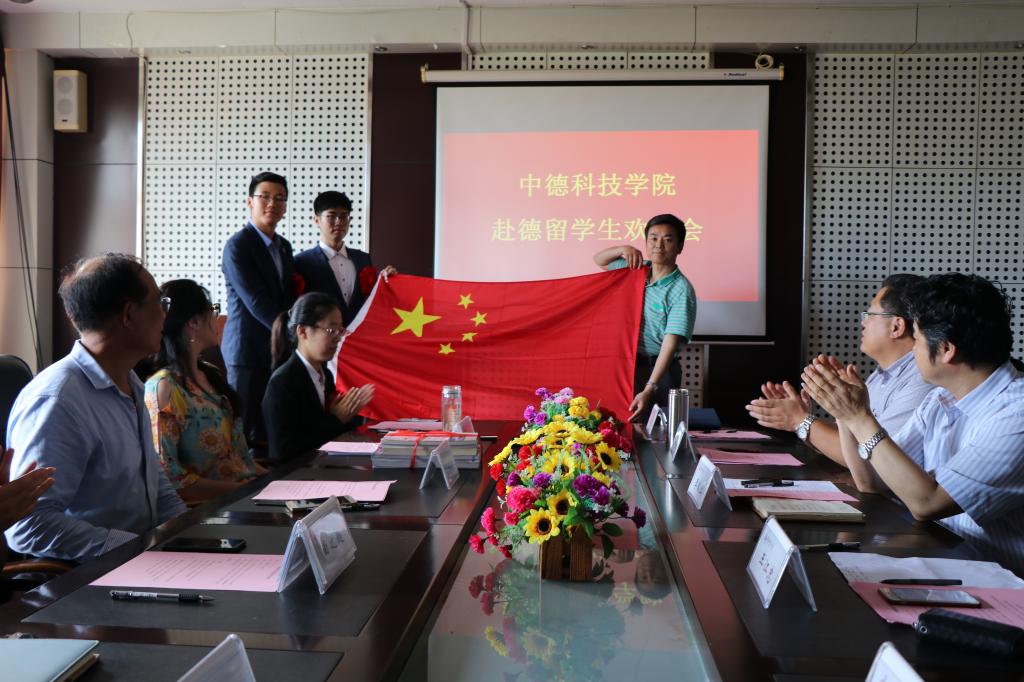 党总支书记王江忠宣读出国学生名单并为出国学生赠送国旗,提出了殷切期望:希望同学们多与德国学生交流,较快的融入德国高校的学习和生活;心系祖国,早日学成归来为中华民族伟大复兴贡献青春力量。