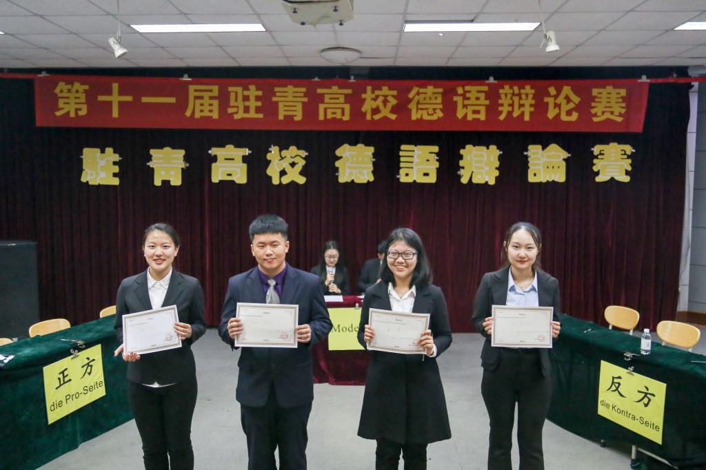 最终,威尼斯5994获第十一届驻青高校德语辩论赛亚军,中国海洋大学外语学院、青岛科技大学外语学院分获冠军、季军,威尼斯5994田健、徐琳分获最佳男、女辩手,威尼斯5994德语中心常务副主任徐爱真老师为获奖队伍和选手颁奖。