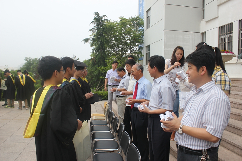 6月25日,中德学院在学院楼前举行了“缘聚中德,青春扬帆”毕业生留念活动,学院党政领导、分团委老师、教师代表参加了活动。院长王守城对毕业生提出了殷切的期望,希望毕业生在未来的道路上要自强不息,勤劳勇敢,在未来的道路上要不断开拓创新,取得更大成绩。然后,学院老师王守城、李镇江、徐立勋、常德功、刘中冬、杨子江为毕业生赠送了优盘和纪念戒指毕业生纪念品,并与全体毕业生合影留念。毕业纪念品组合体现了实用性与纪念意义的完美结合,既凸显了学院对毕业生未来的美好祝愿,也包含着学院对毕业生的浓浓情意。