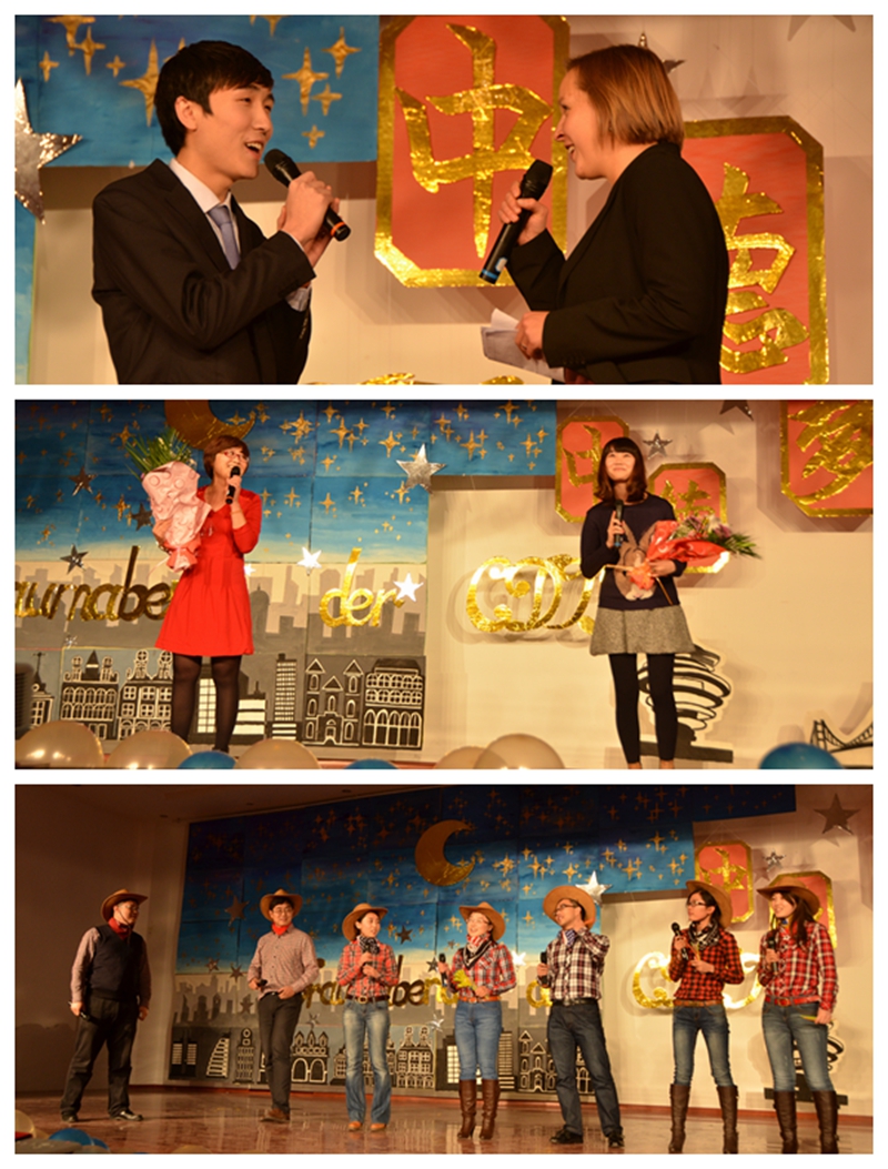 晚会开场前首先播放了一年来学院学生的精彩瞬间,海外学生为国内的学弟学妹们送上了祝福,学院领导也通过视频的方式表达了对学生深深的祝福和殷切的期盼。6点30分,舞起乐鸣,晚会在富有激情的开场歌舞《欢聚中德》中拉开了序幕。四位主持人采用中德双语主持的形式闪亮登场,充分展示了学院特色和学生风采。
