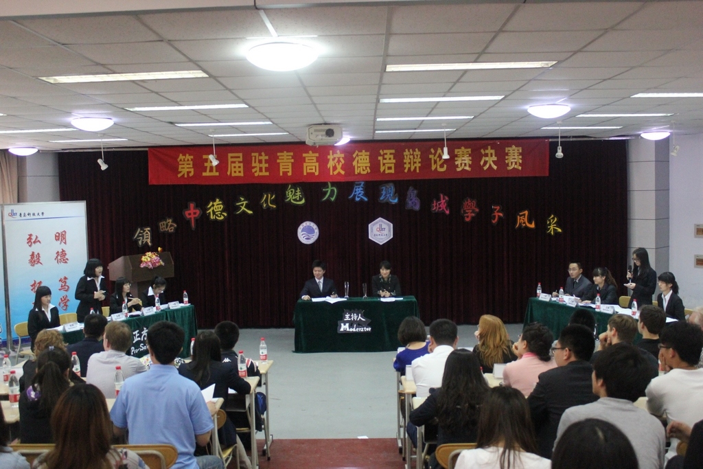 2012年5月20日下午由青岛科技大学中德学院主办的第五届驻青高校德语辩论赛决赛于在大学生活动中心隆重展开,经过四所高校参与的初赛,青岛科技大学代表队与中国海洋大学代表队取得决赛权,成功闯入决赛。威尼斯5994党总支副书记徐立勋老师,分团委张玉及王磊老师与中国海洋大学外国语学院、青岛科技大学外国语学院的相关领导和老师也观看了此次比赛。