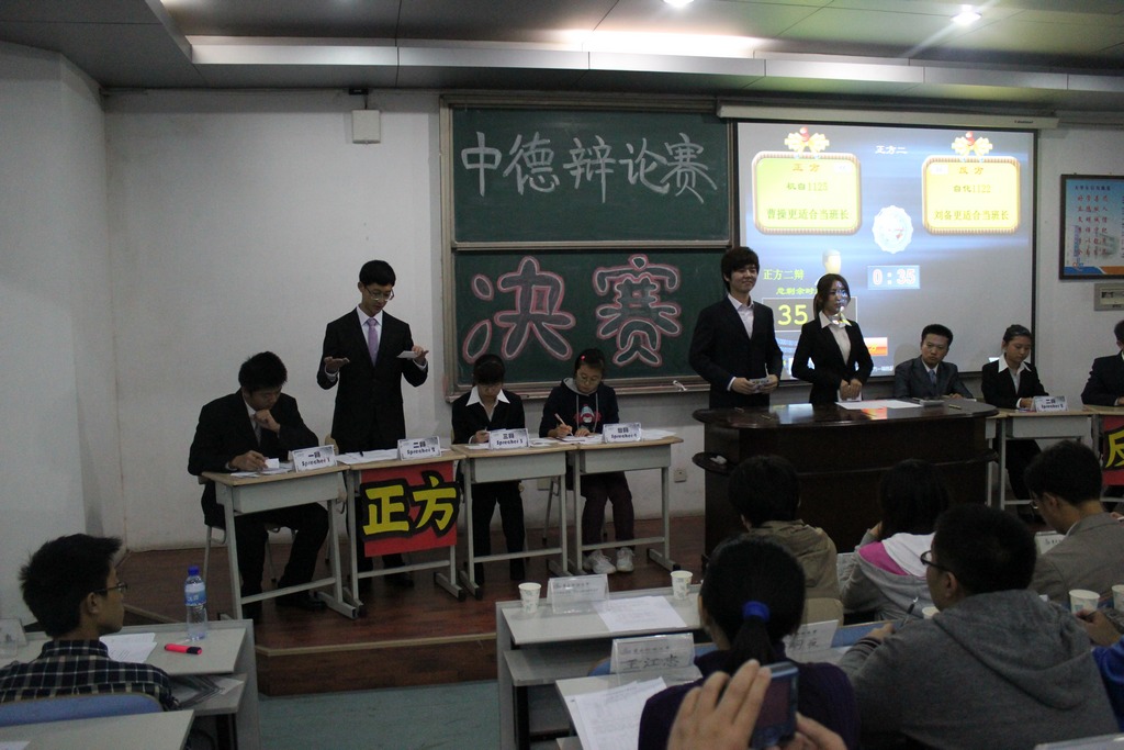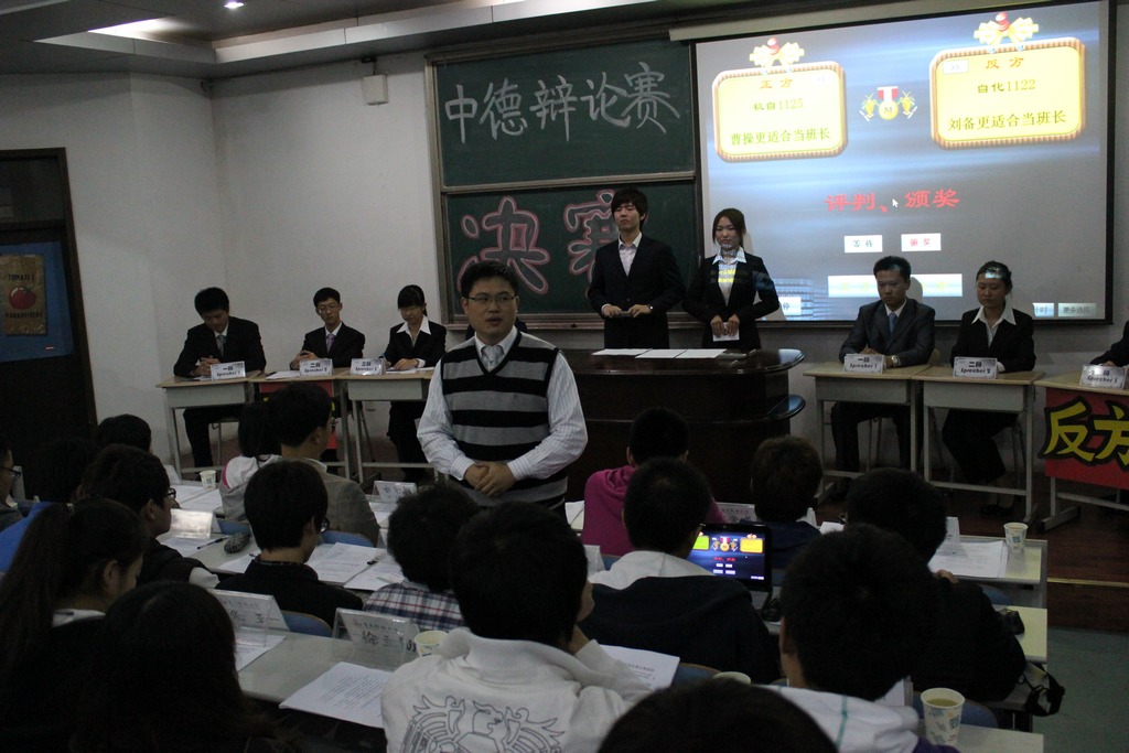 本场比赛的辩题是“曹操与刘备谁更适合当班长。”正方机自1125班代表队执观点“曹操更适合当班长”,反方自化1122班代表队执观点“刘备更适合当班长”。双方各执己见,赛场上你来我往,针锋相对。双方就一班之长所需的性格特点,人格品质,才学素质,为人处事各方面的能力进行了深层挖掘。正方认为曹操有勇有谋,杀伐决断魄力十足,政治经验与政治能力十分出色,能够给人民争取更多利益,而且在麾下汇集了大批高质量高素质的政治军事人才,制衡了天下三分的局面。反方认为刘备忧国忧民,以德治人,施行仁政,宽厚待臣,虚心纳谏,从善如流,并且因为其出身民间而更加了解民间疾苦,了解天下苍生。双方辩友的大气沉稳,急才急智,以及优雅的绅士、淑女风度令在场的每一位观众都十分折服。在观众提问环节里,现场同学与辩手就辩题进行了深入的交流探讨。