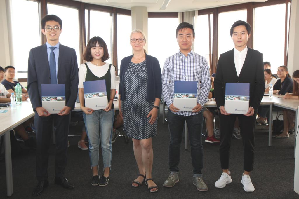 帕德博恩大学机械专业合作项目负责人Zimmer教授为他们颁发了奖学金证书。学生们表达了自己对青岛科技大学和帕德博恩大学的感谢之情,使得自己能够非常快的融入到德国的学习和生活中,并取得优异成绩。