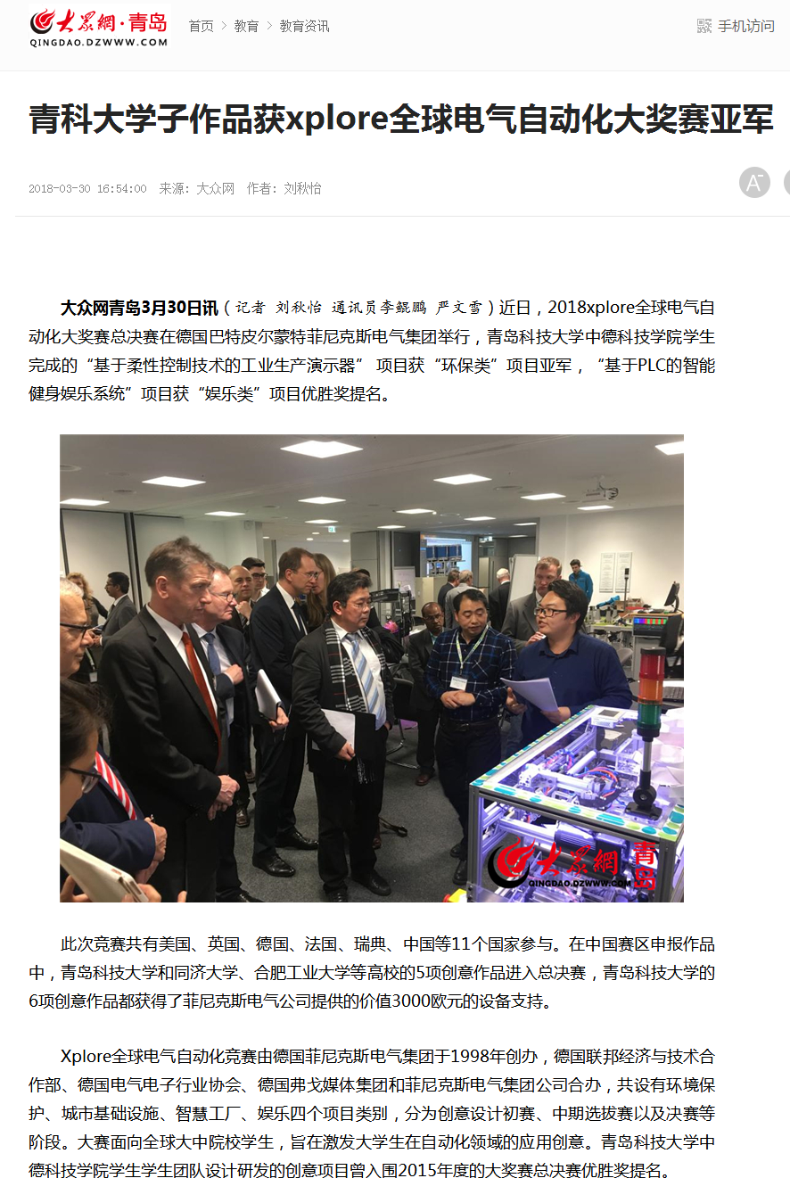 大众网报道青科大学子作品获xplore全球电气自动化大奖赛亚军