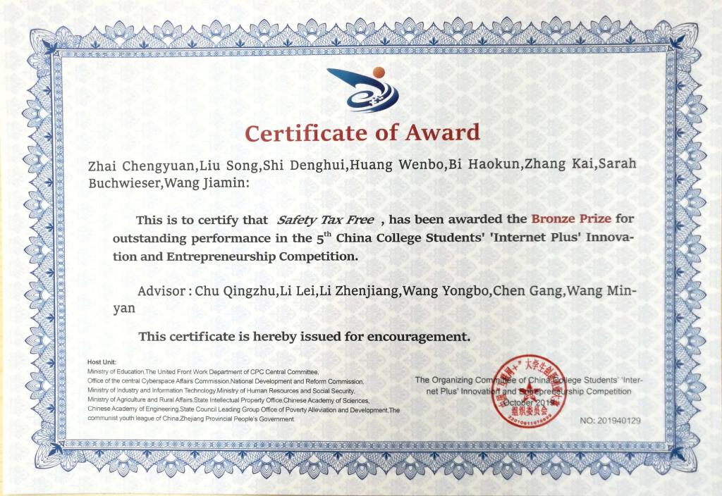 日前,第五届中国“互联网+”大学生创新创业大赛全国总决赛圆满落下帷幕。威尼斯5994优秀校友、德国慕尼黑工业大学毕业生翟程远、刘嵩等创业项目《Safety Tax Free》荣获本届“互联网+”大赛国际赛道铜奖。这是学校在“互联网+”大赛国际赛道上获得的首个国家级奖项,是2019年学校在第五届中国“互联网+”大学生创新创业大赛全国总决赛中获得的2项国家级铜奖之一。