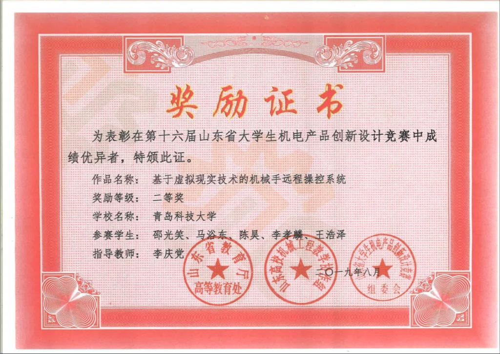 8月13日至15日,“临工杯”第十六届大学生机电产品创新设计竞赛总决赛在日照职业技术学院举行,此项赛事由山东省教育厅主办,山东高校机械工程教学协作组承办。青科大中德学子经过网评、预赛等选拔环节进入决赛,《基于虚拟现实技术的机械手远程操控系统》项目获二等奖。