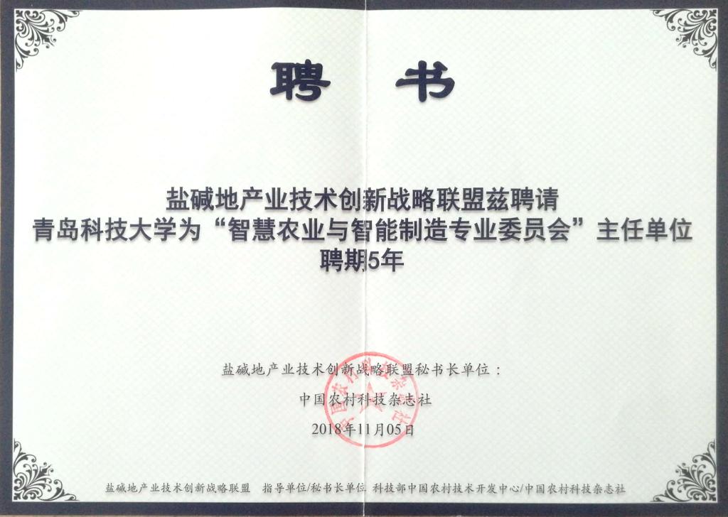 1月18日,盐碱地产业技术创新战略联盟理事会在北京召开,国务院参事室、科技部中国农村技术开发中心、中华全国供销合作总社、联盟理事长单位中国科学院地理科学与资源研究所相关领导出席活动。青岛科技大学获聘“盐碱地产业技术创新战略联盟——智慧农业与智能制造专业委员会”主任单位,青科大中德经济工程研究所获聘执行主任单位,李庆党教授获聘为执行主任,获颁聘书。