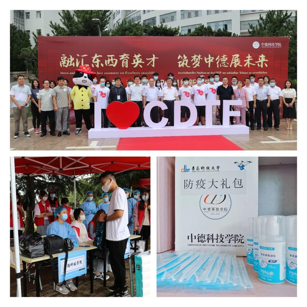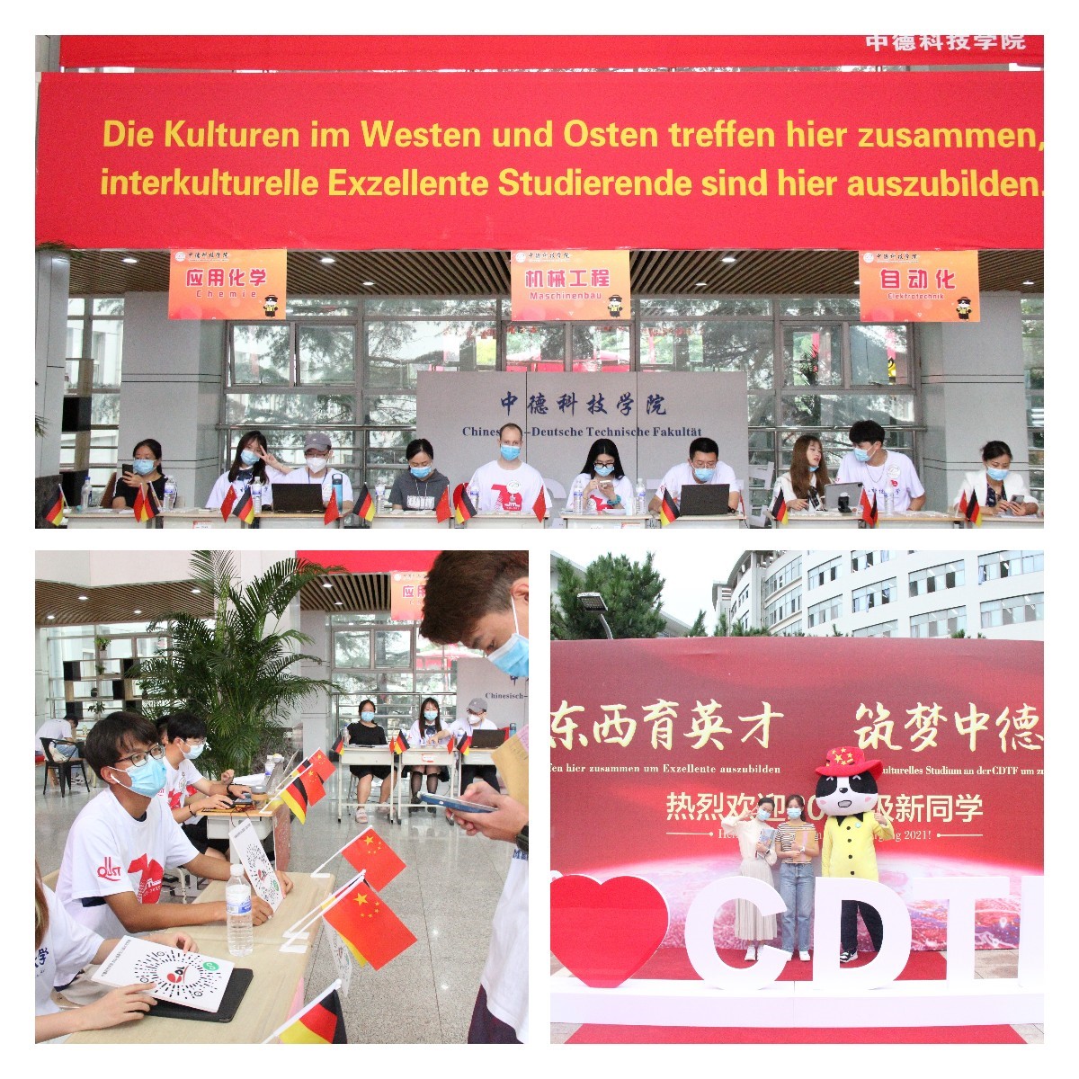 筑梦中德,国际氛围。报到大厅悬挂中德两国国旗,横幅标语采用中德双语,开展贴心志愿服务,优化报到流程,引导新生自主报到。报到现场,德国的外教老师与新生亲切问候,并答疑解惑。迎新红毯、报到背景打卡墙,体现中德两国文化的吉祥物中德大福在学院楼前与新生拍照留念。积极营造“激动、互动、感动”的报到氛围,为学生打造一个难忘的开学季。