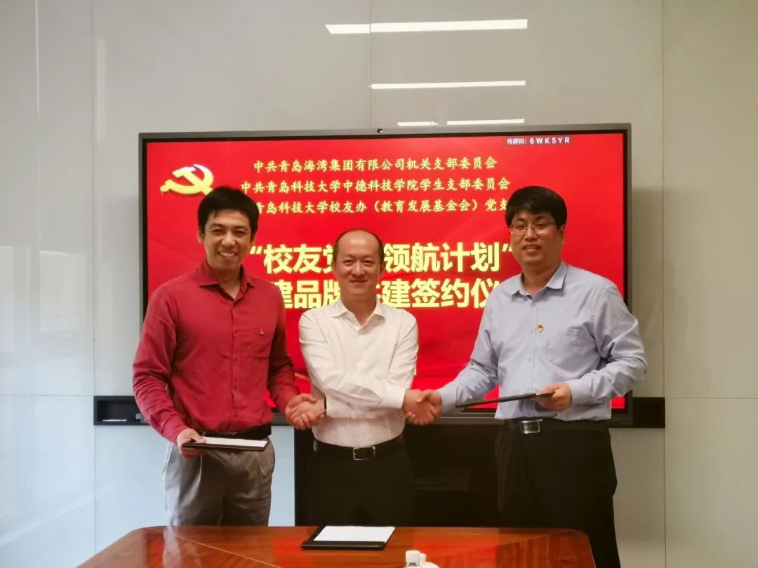 5月13日下午,由青岛科技大学校友工作办公室(教育发展基金会)牵头,中共青岛海湾集团有限公司机关支部委员会和学院学生支部委员会的“校友党员领航计划”党建品牌共建签约仪式在青岛海湾集团党员活动室举行。校友办(教育发展基金会)党支部书记王泽鹏、海湾集团机关支部书记王昊、威尼斯5994党委副书记马骥分别代表相关党支部签约。