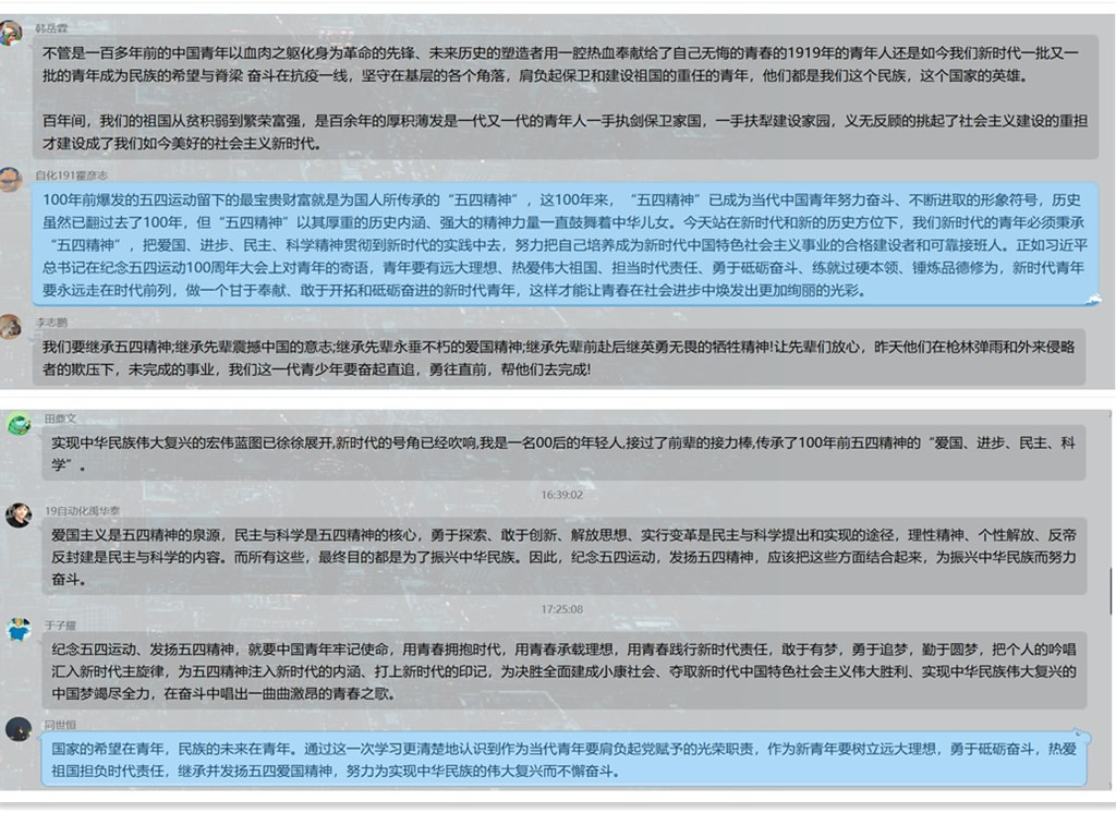 中德团员青年,化身“收信人”“云接力”,参与教育部思政司指导、人民网出品H5《我们都是收信人》,以新时代的责任担当作答青春三问,选择成长答案,递交人生答卷,共同学习习近平总书记重要回信精神。中德学子通过学习强国、微博、微信、快手、今日头条等线上平台参与团中央“让青春为祖国绽放”主题团日活动,同时以党团支部为单位,组织学生广泛开展线上学习座谈、交流讨论、集体观影等活动,进一步学习了解五四运动的历史背景、历史意义,领会和传承五四运动的精神要义,增强青年的历史使命感和责任担当,实现使命与成长的对话。