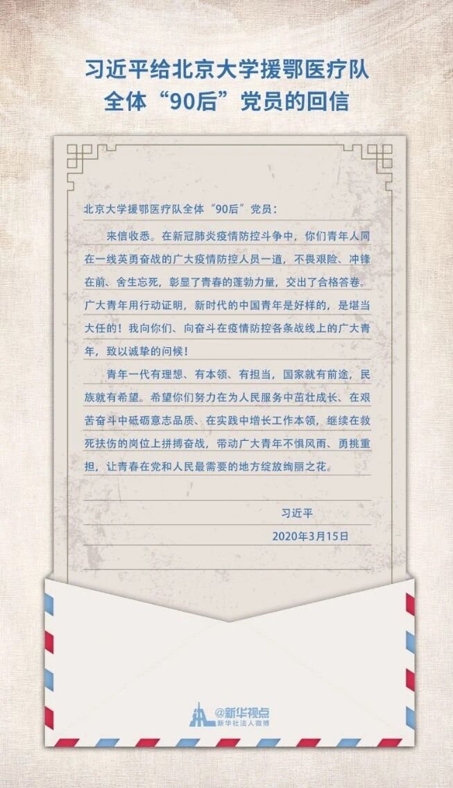 3月15日,习近平总书记给北京大学援鄂医疗队“90后”党员回信,向他们和奋斗在疫情防控各条战线上的广大青年致以诚挚的问候,勉励广大青年不惧风雨、勇挑重担,让青春在党和人民最需要的地方绽放绚丽之花。威尼斯5994组织学生认真研读了习近平总书记的回信内容,并结合自身实际情况畅谈体会,大家纷纷表示,一定牢记总书记谆谆嘱托,以总书记的勉励为动力,努力成为有理想、有本领、有担当的新时代青年。