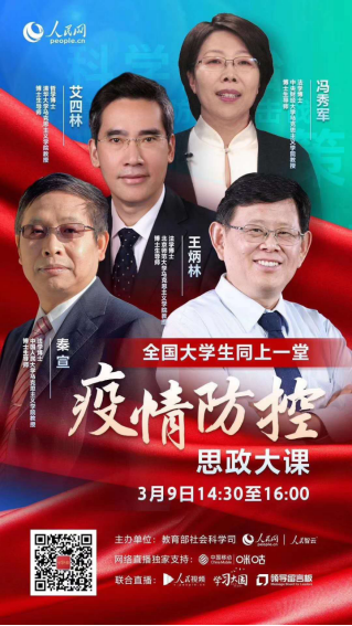据悉:全国大学生同上一堂疫情防控思政大课”由教育部社科司与人民网联合组织,邀请清华大学马克思主义学院教授艾四林、中国人民大学马克思主义学院教授秦宣、北京师范大学马克思主义学院教授王炳林、中央财经大学马克思主义学院教授冯秀军四位专家进行直播授课,结合“马克思主义基本原理概论”“毛泽东思想和中国特色社会主义理论体系概论”“中国近现代史纲要”“思想道德修养与法律基础”四门必修课教学内容,主要解读党中央关于疫情防控的决策部署,分析中国抗疫彰显的中国共产党领导和中国特色社会主义制度的显著优势,讲述防疫抗疫一线的感人故事,发挥高校思政课落实立德树人根本任务的关键课程作用,引导大学生传承和弘扬爱国主义精神,增强“四个自信”。据统计,5027.8万人次观看了直播,相关网站、客户端、社交媒体访问量达1.25亿人次。