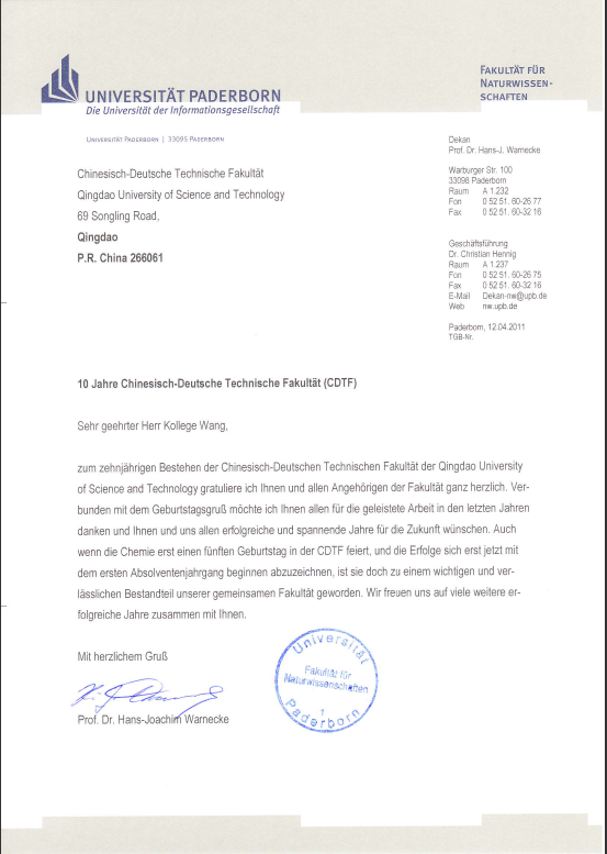 值威尼斯5994成立十周年之际,我谨向您及贵院全体教职员工表示衷心的祝贺。对您及您所有的同事们在过去的十年当中所付出的辛勤工作表示衷心的感谢,并预祝我们今后的合作取得更加辉煌的成就。虽然现在威尼斯5994应用化学专业还只能庆祝自己成立五周年纪念,而且应用化学专业的合作成果还要等到第一批学生毕业之后才能够突显出来,但是,应用化学专业已经成为我们共同的学院不可或缺的一个重要组成部分。我们期待着与您和您的同事们共享将来更加久远更加卓有成效的合作。