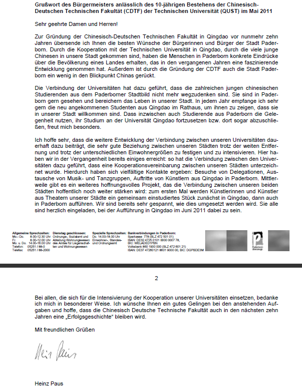 青岛科技大学和帕德博恩大学两校间的紧密联系,使得数量众多的年青的中国留学生已经成为帕德博恩市不可或缺的一道亮丽的风景线。他们在帕德博恩市广受欢迎,他们的到来为我们这座城市的生活增添了更加绚丽的色彩。每年我本人都非常乐意在市政府接待来自于青岛市的新同学们,旨在表达这座城市对他们的诚挚欢迎。让我感到特别高兴与欣慰的是,现在帕德博恩大学的学生同样有了去青岛科技大学学习的机会,甚至可以在那里完成自己的学业。