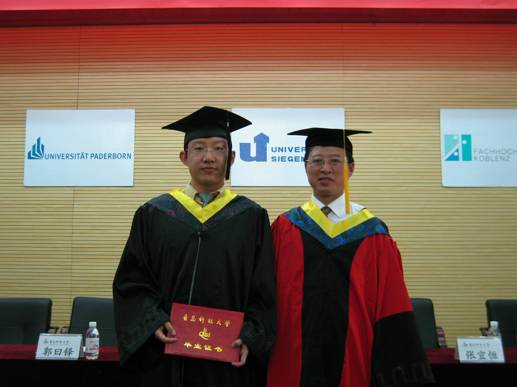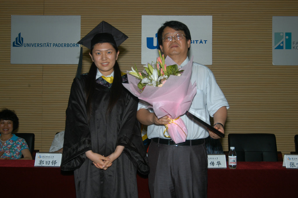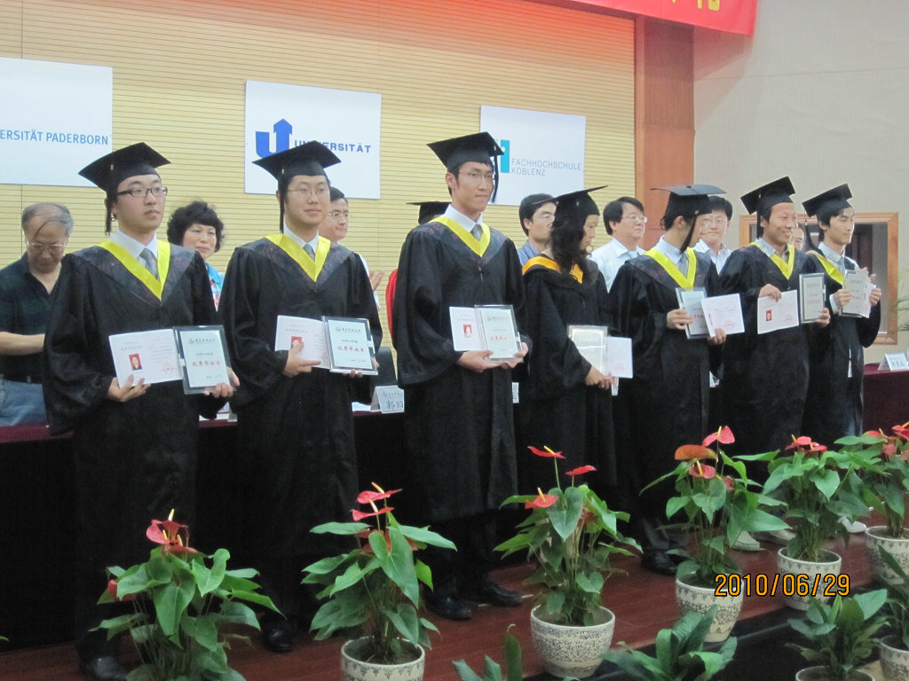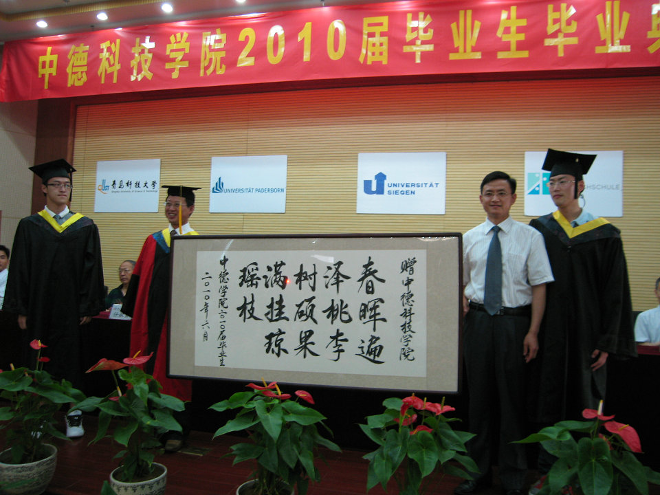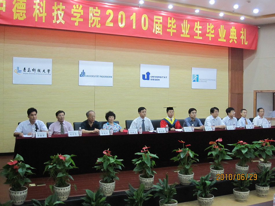 6月29日下午2点,中德学院2010届毕业生典礼在崂山校区第一报告厅隆重举行。校团委书记刘传华、国际学院院长张宜恒、教务处副处长任素贞、国际处副处长王灏、学院院长王守城、学院党总支书记郭曰铎以及各部门负责人、全体政治辅导员和毕业班班主任、2010届全体毕业生、部分学生家长和企业代表参加了典礼。学院分团委书记李春家主持了典礼。