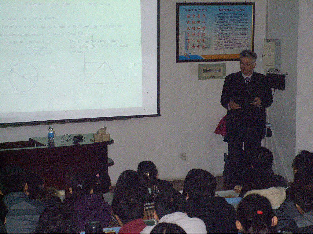 在访问期间,库克勒教授受数理学院邀请,为数理学院师生做了一场生动地学术报告,介绍了他在过去几年中在应用数学方面的科研成果。另外,库克勒夫人做为语言教学专家,与中德学院语言培训中心的老师们进行了座谈,在语言教学法及德语教学方面的最新动向做了卓有成效的沟通交流。