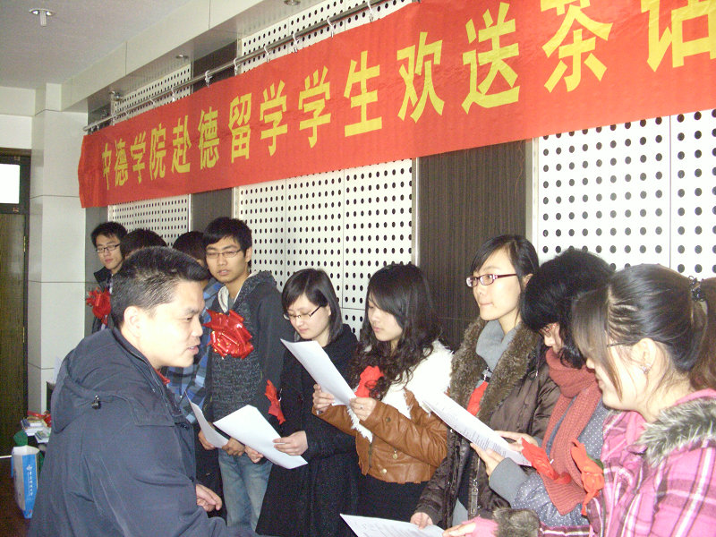 中德学院此次有10名同学出国深造。欢送会上,院长王守城在讲话中对出国同学提出三点希望,他指出同学们出国后面临的第一项任务是专业德语培训,希望同学们按时完成培训任务;同学们出国后要互帮互助,团结一心;希望同学们要形成良好的习惯,时时处处体现出中国人的优良品德。副院长薄建全发表了热情洋溢的讲话,他首先对大家通过辛勤努力被德国高校录取表示祝贺。薄建全副院长在讲话中向出国同学提出四点殷切期望。他指出,同学们出国留学要时刻胸怀祖国,把个人命运与祖国命运结合起来;希望同学们要将个人聪明才智与先进的思维方式结合起来;希望同学们出国后要尊重当地的法律习俗生活方式;希望同学们要自信、自重、自爱,同时还要做到礼貌谦虚。会上,薄建全副院长还谈到了学校实施国际化战略的工作目标。薄建全副院长最后祝愿同学们尽快适应留学生活,早日完成学业,报效祖国。会上,学生代表胡晨、付世豪、刘天瑜同学分别代表出国学生和在校生发言。