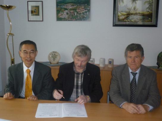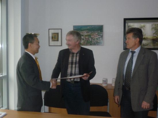 (签署协议仪式,中间为德国伊尔梅瑙工业大学Scharff校长,旁边分别是伊尔梅瑙大学机械系主任Kurtz教授和中德学院副院长薄建全教授)