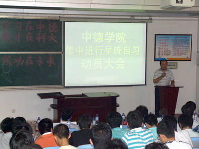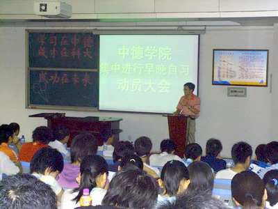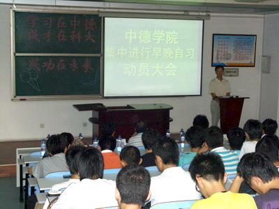 中德学院实行集中早晚自习制度是学院加强学风建设,推动“学习在中德成才在科大成功在未来”主题教育实践活动深入开展的重要举措。据悉,学院实施的集中早晚自习制度将每周周一至周五的早上和晚上分为4个单元,每个单元3个学时,每个单元均配备3到5名德语、专业和管理的老师进行辅导和管理。目前,07和08级的学生均须参加集中早晚自习。