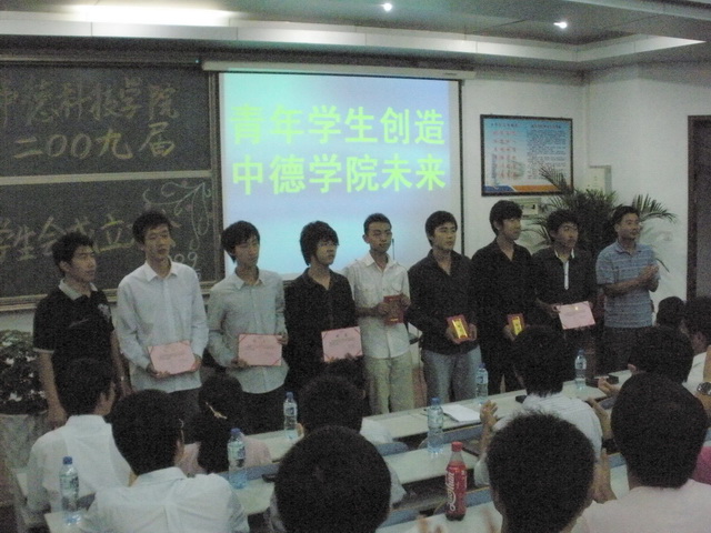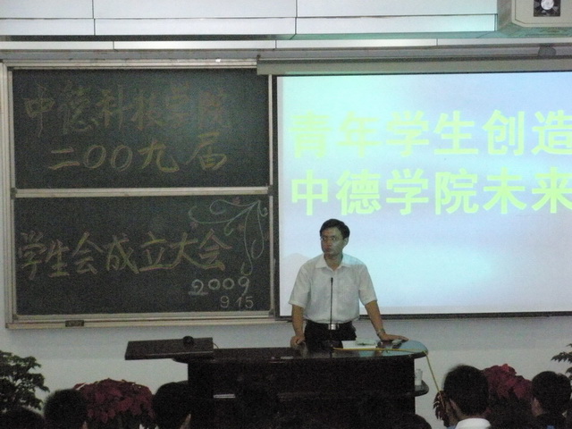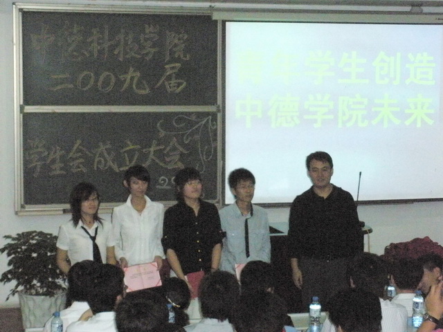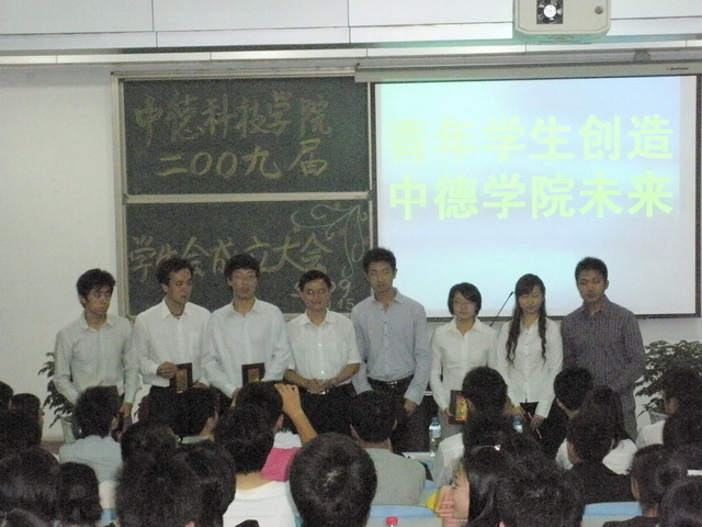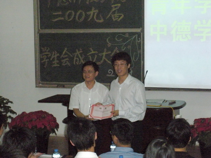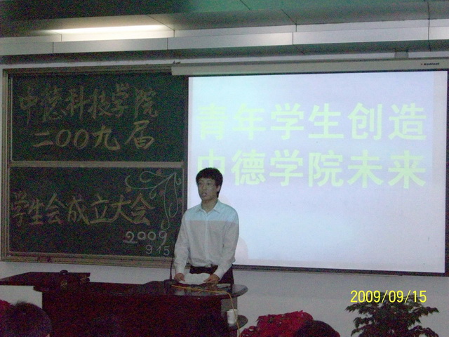 9月15日晚6:30中德学院2009届学生会成立大会在学院讲学厅隆重召开。中德学院党总支书记郭曰铎、外语学院分团委书记卢中彬、校团委文体活动部部长范延安、数理学院分团委书记张霄以及校学生会主席、各兄弟学院学生会主席共同出席了成立大会。我院全体学生会干部、学院各班班长参加了成立大会。成立大会由学院团委书记李春家主持。