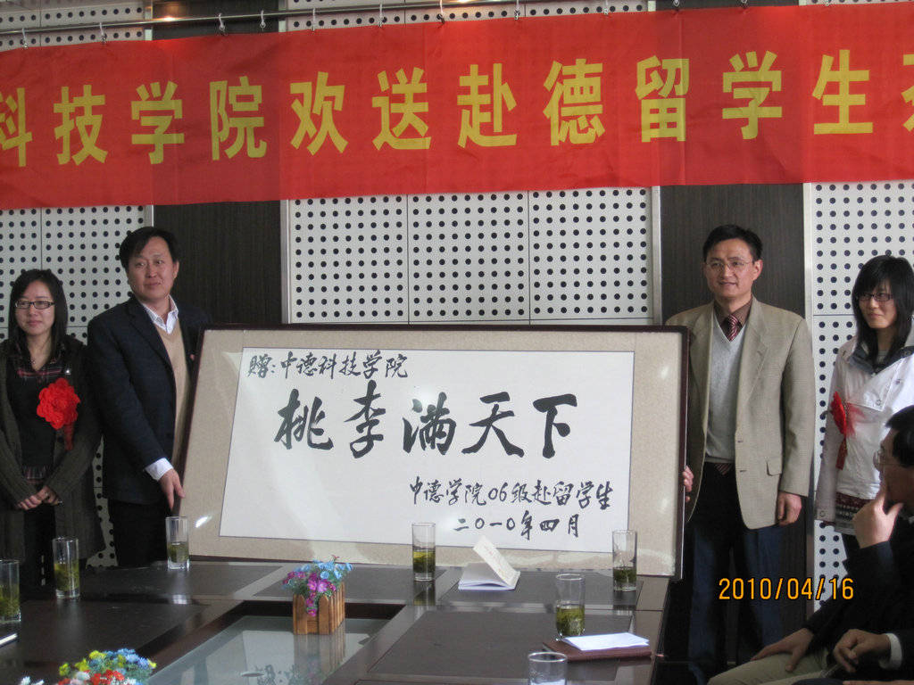 4月16日,中德学院召开2010年首批赴德留学生欢送会。国际处、学生处、校团委等部门领导以及中德学院领导和师生代表参加了欢送会。分团委书记李春家主持了欢送会。