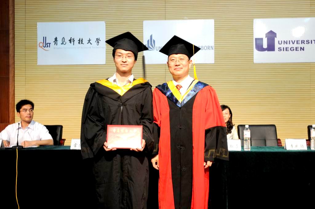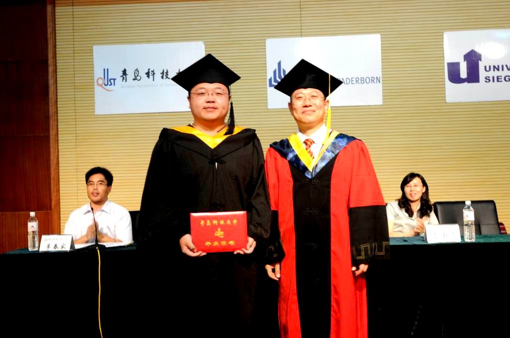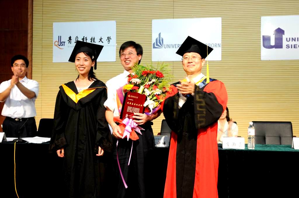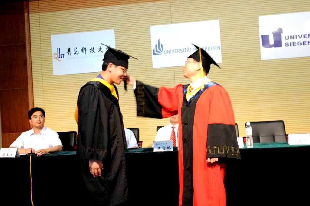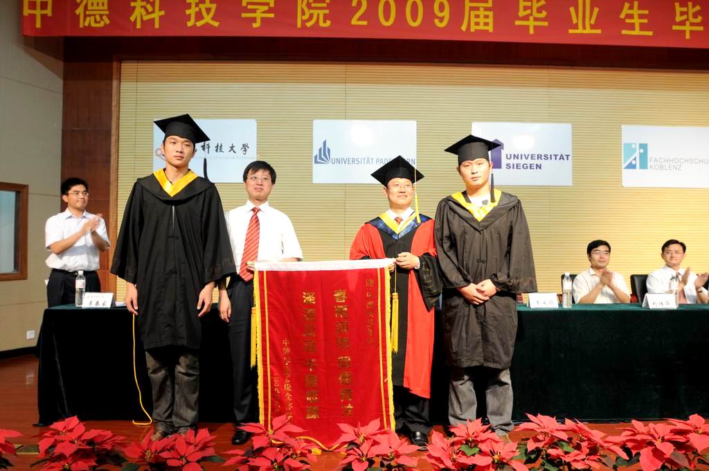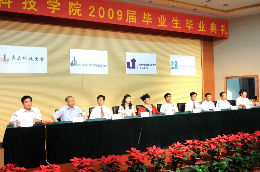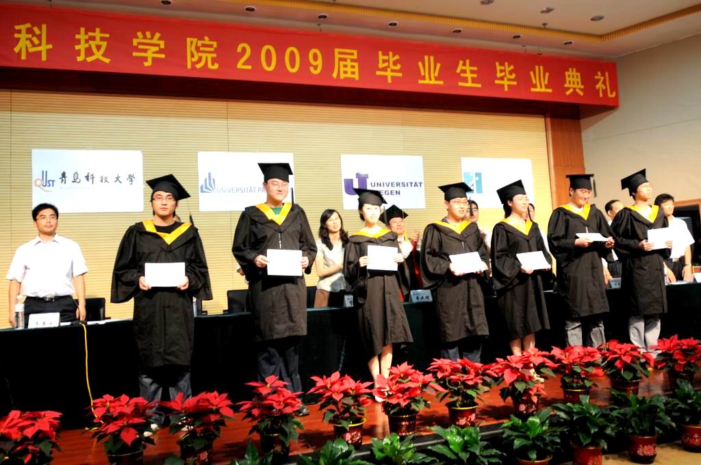 毕业典礼上院长王守城代表学院全体师生员工向圆满完成学业的81名毕业生同学表示最热烈的祝贺。向为培养广大同学而付出了辛勤劳动的广大教职员工、家长和社会各界表示最衷心的感谢。王守城在讲话中回顾了同学们在校学习五年来学院的发展历程,他指出,这五年是学校和学院历史上发展最快的五年,学校顺利通过了教育部本科教学水平评估,本科生规模保持稳定,研究生规模逐步扩大,新生生源质量进一步提高;学院顺利通过了德意志学术交流中心和中华人民共和国教育部的评估及复核验收,取得了教育部颁发的中外合作办学许可证书;在与帕德博恩大学合作的基础上,学院又先后与科布伦兹应用科技大学和锡根大学签订合作办学协议,从而走上了规范化、多元化发展的轨道;学院的学科建设取得了重大突破,合作办学专业由一个增加到三个,学生出国人数逐年增加;师资队伍建设取得较大进展,目前德语教师人数已经达到25名,其中签约德籍教师9名;几年来中德双方的学术交流不断加强。讲话中,王守城向毕业生提出三点希望,一要秉承传统,务实创新。他指出科大以"实"建校,以"实"兴校。希望同学们牢记母校“吃苦耐劳,坚忍不拔,朴实无华,甘于奉献,同心协力,勇承重载”的橡胶品格,在各自的领域里不断取得新的成就。二要海纳百川,追求卓越。他指出一滴水只有溶入大海方显生命和活力,同样,一个人只有融入团队才会发挥出更强大的力量。希望同学们在今后的学习和工作岗位上既要谦虚谨慎、不骄不躁,又要海纳百川,善于听取不同的意见。要胸怀祖国、放眼世界,为民族的崛起,为国家的繁荣做出应有的贡献,无愧于科大人的称号。三要留住梦想,谨慎选择。他指出激情与梦想是青年人的宝贵财富,人生的选择总是与责任同在。面对全球化竞争中建设创新型国家的艰巨挑战,面对中华民族伟大复兴的历史机遇,我们都必须勇于面对现实,勇于承担责任;决不逃避,决不弃权。只要坚持不懈地做事,最后终能成功;若不做事,则肯定不会成功。王守城在讲话最后指出科大永远是我们大家共同的家园,希望同学们常回来看看,衷心祝愿同学们身体健康,工作顺利,家庭幸福,事业有成!