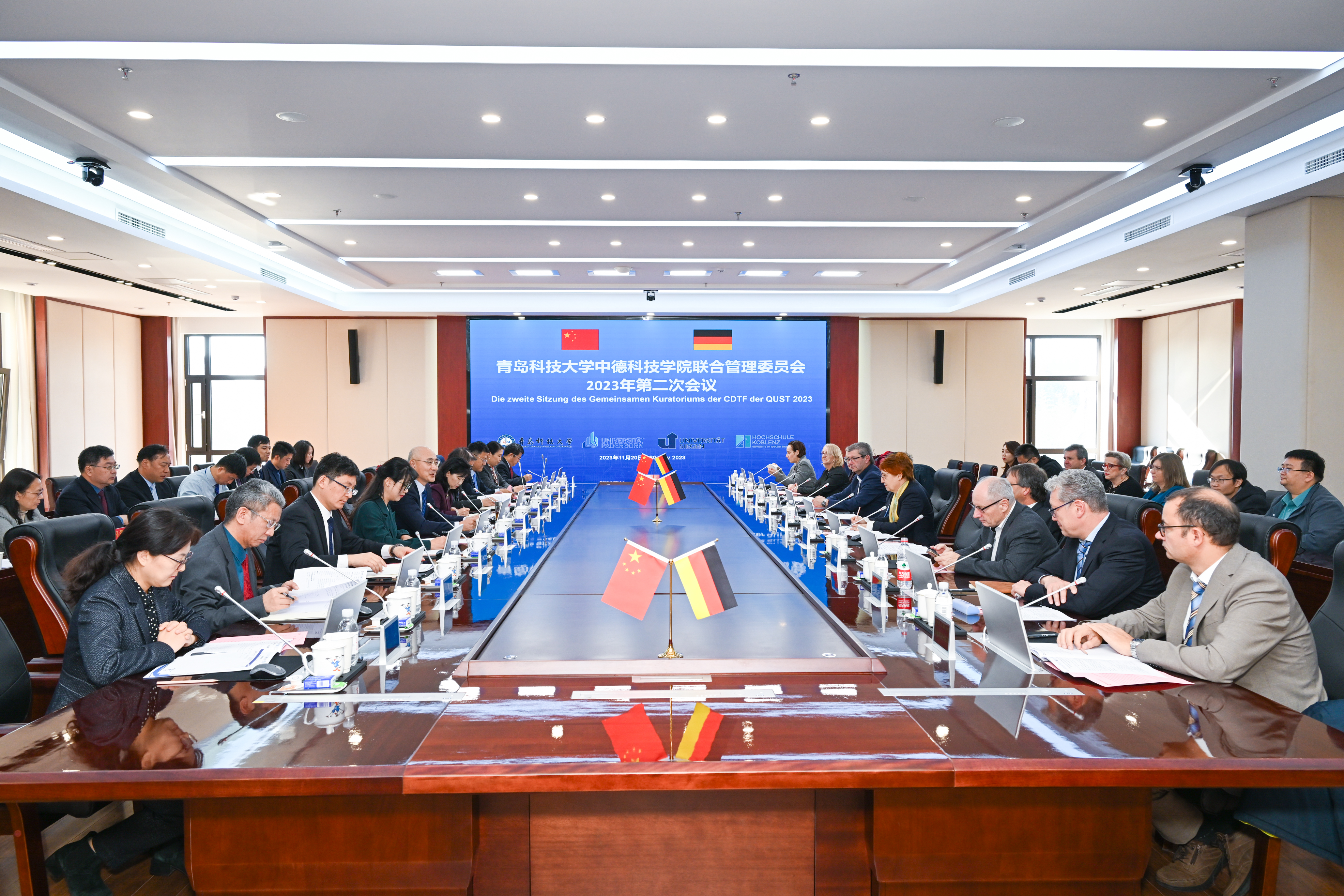 11月20日,学院联合管理委员会2023年第二次会议在赛轮会议室召开。德国帕德博恩大学校长里格拉芙、锡根大学项目负责人格雷泽、科布伦茨应用科技大学项目负责人潘道夫、德国各合作大学代表,青岛科技大学校长陈克正、党委副书记沈文青,党委常委、副校长李志波以及学校相关部门、学院负责人参加会议。沈文青主持会议。
