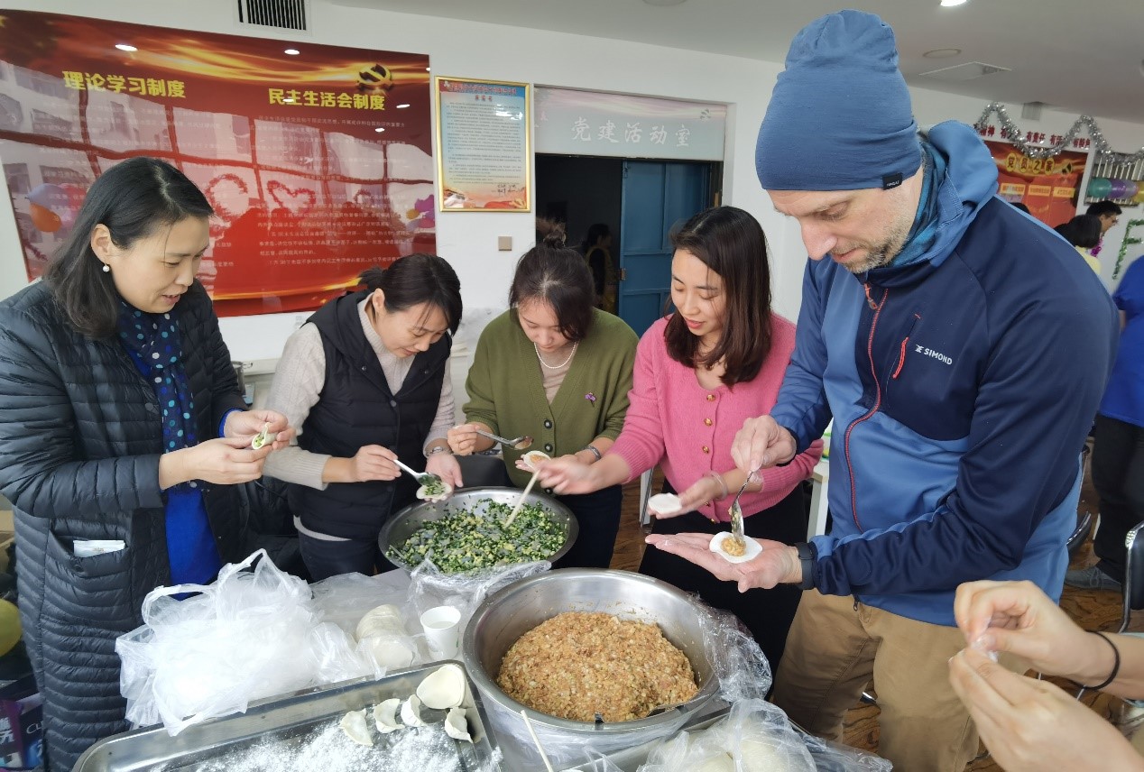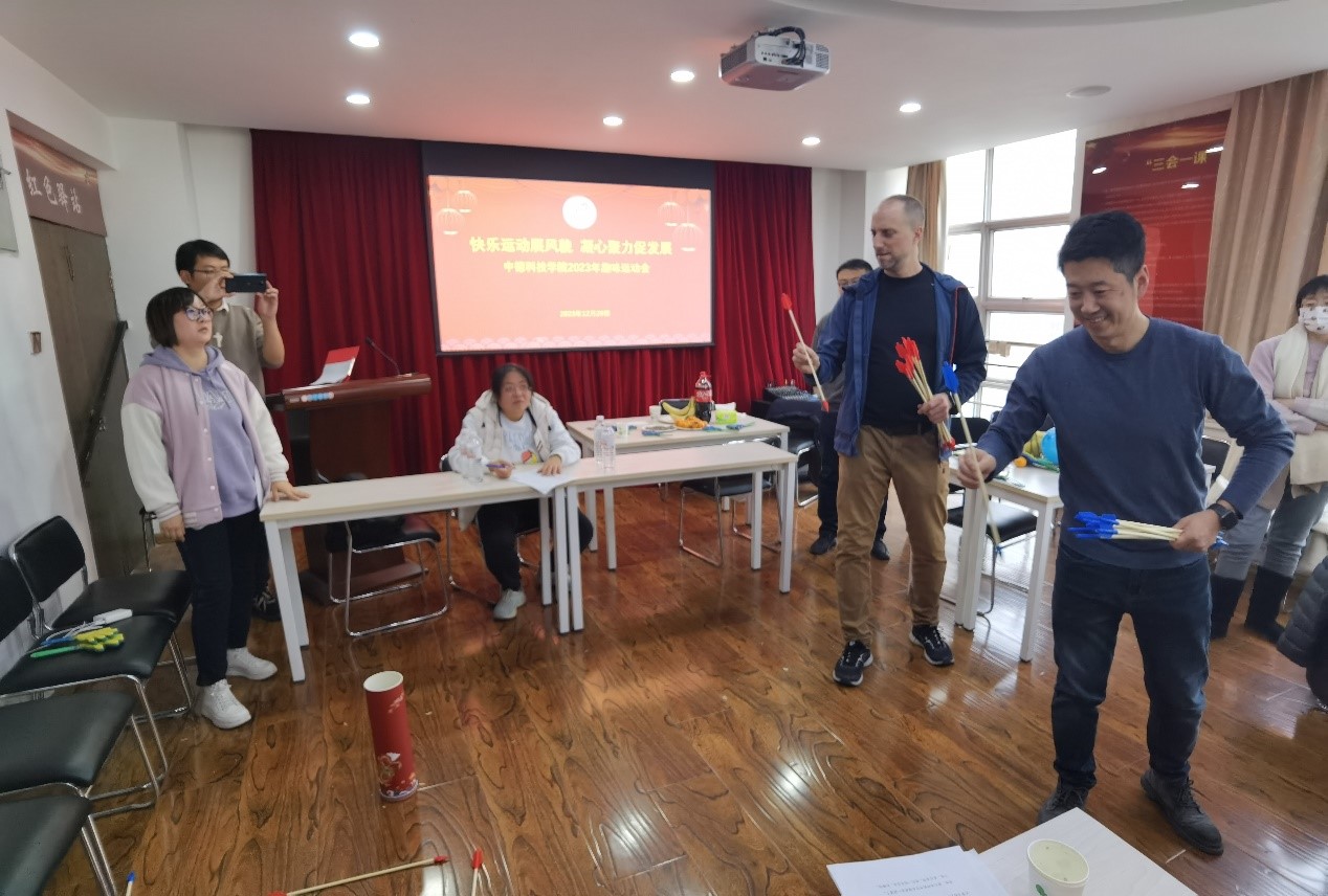节目表演结束后,正式进入了“快乐运动展风貌,凝心聚力促发展”趣味运动会环节。此次趣味运动会进行了“面对面抢水瓶”和“趣味投壶”两个游戏。在游戏环节中,中德双方的教职工们精神饱满,活力十足,全力以赴,既彰显了个人风采,赛出了集体的凝聚力,又让德国教师感受到了投壶这项中华传统体育项目的魅力。游戏过程中,中德双方教职工们一起包饺子,相互切磋、交流包饺子技术,一边分享着一年来工作的喜悦和困惑,烘托出浓厚的节日氛围。