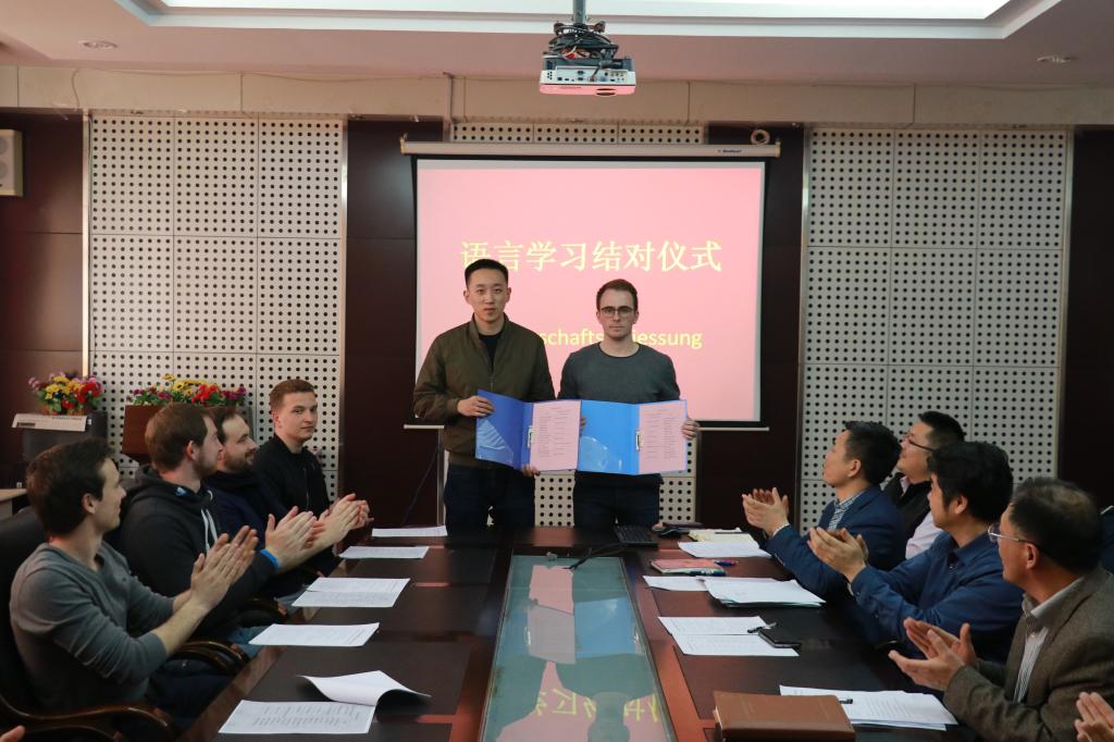 会上,院长李镇江对来学院工作的德籍外教以及学习交流的德国留学生表示欢迎,并指出德国留学生的到来提高了学院的国际化办学水平,希望同学们以此次学习交流为契机,深入了解中国优秀的传统文化,并与学院学生“结对子”互相学习,共同进步。他同时感谢2位德籍教师来学院工作,希望他们在学院工作愉快。